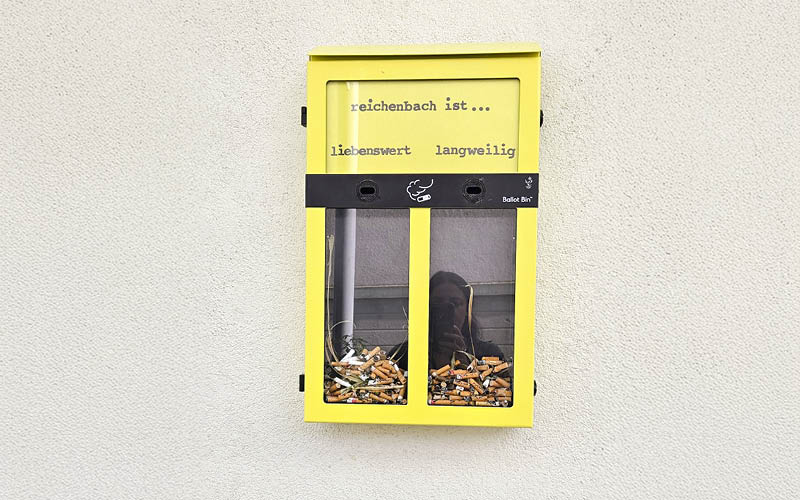 Die Wahlurnen-Aschenbecher sind mit Entscheidungsfragen versehen. Mit dem Einwurf von Zigarettenstummel kann man abstimmen. Dies hilft in der Innenstadt Müll zu reduzieren, das Verhalten von Menschen positiv zu beeinflussen und die Teilhabe zu erhöhen, indem Gesprächsanlässe geboten werden.