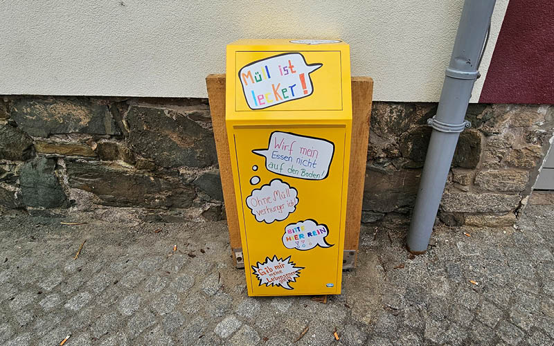 Die Mülleimer sind passend in freundlicher Farbe zu den Aschenbechern gestaltet. Ein Aufkleber mit Sprechblase zeigt regelmäßig neue Sprüche, welche Schüler und Schülerinnen der benachbarten Weinholdschule einreichen können.